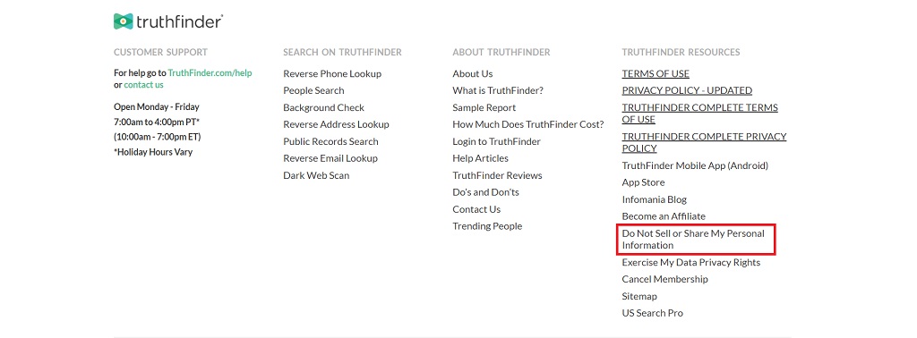 Open the homepage and scroll down to locate the TruthFinder’s opt-out form link.
